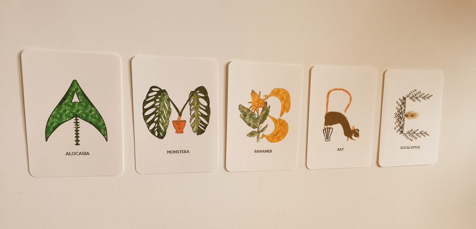 Chaque carte est une petite œuvre d’art : une lettre dessinée à la main, inspirée d’un animal ou d’une plante étonnante, puis imprimée sur un papier texturé haut de gamme, façon Canson.